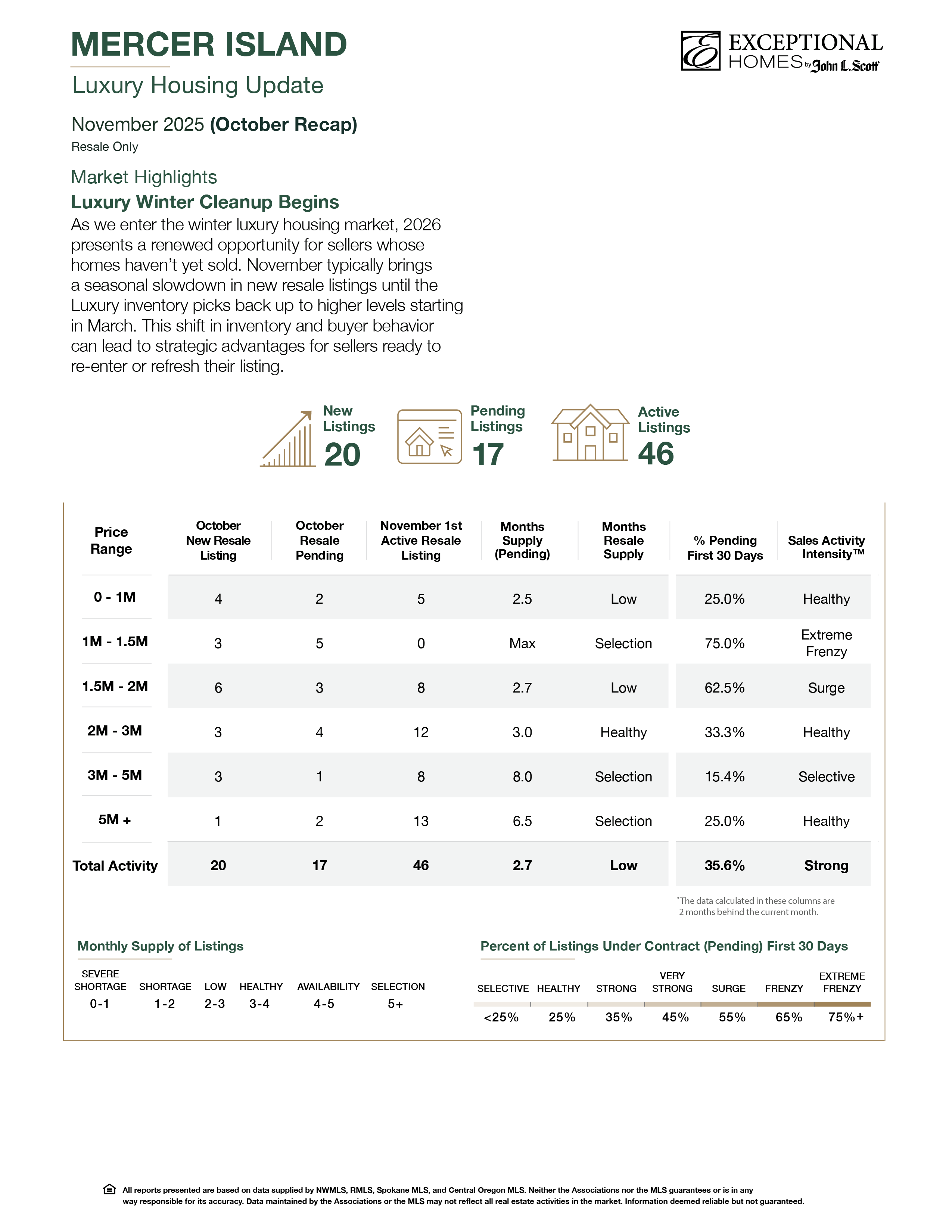November typically brings a seasonal slowdown in new resale listings until the Luxury inventory picks back up to higher levels starting in March. This shift in inventory and buyer behavior can lead to strategic advantages for sellers ready to re-enter or refresh their listing.